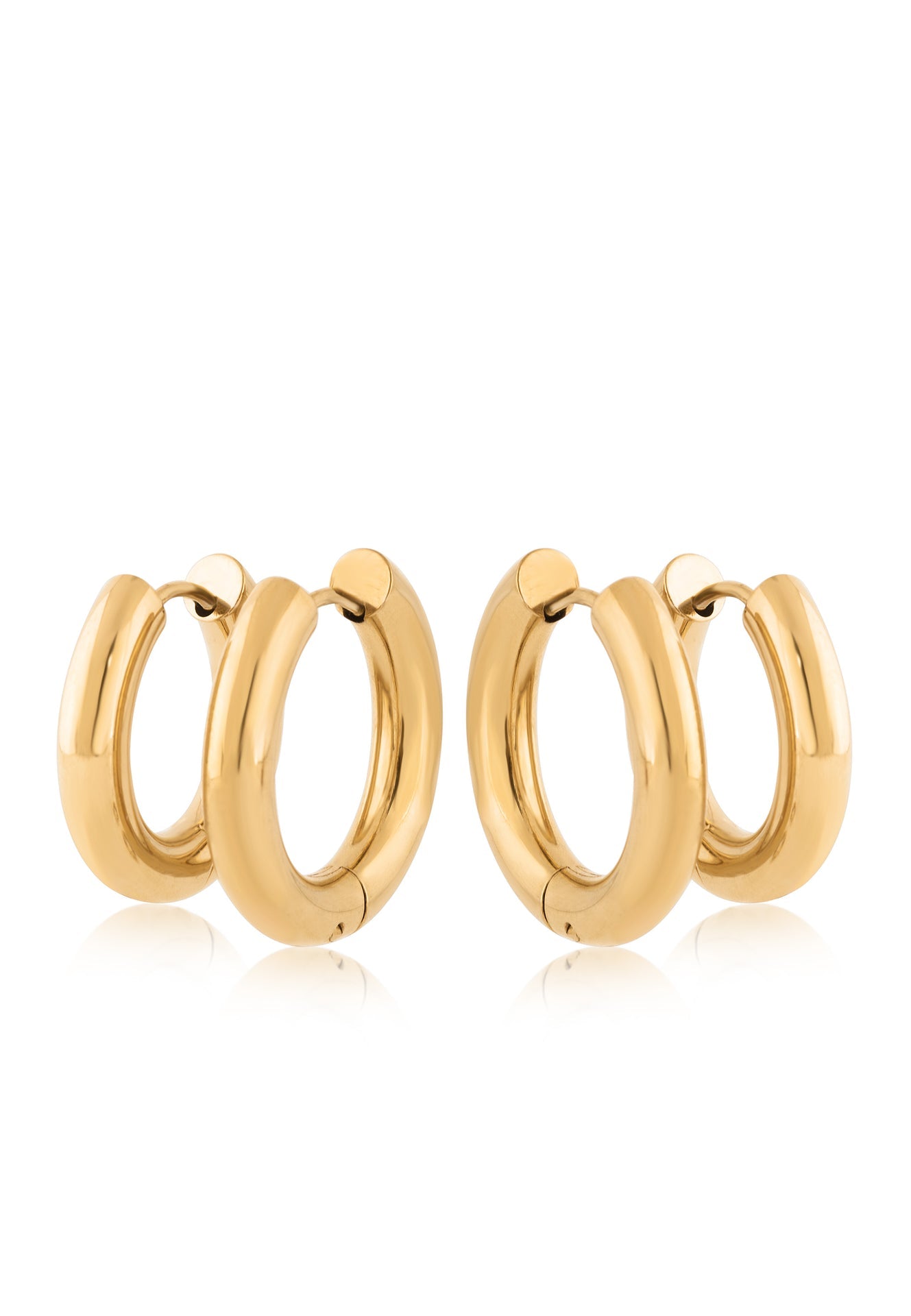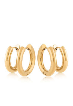 Dos tamaños, infinitas combinaciones. El conjunto Aurora Earring incluye dos pares de aros clásicos en diferentes tamaños: un conjunto versátil para mezclar, combinar o apilar. Hechos de acero inoxidable con acabado dorado pulido, estos esenciales atemporales son tus piezas favoritas para un brillo diario sin esfuerzo.