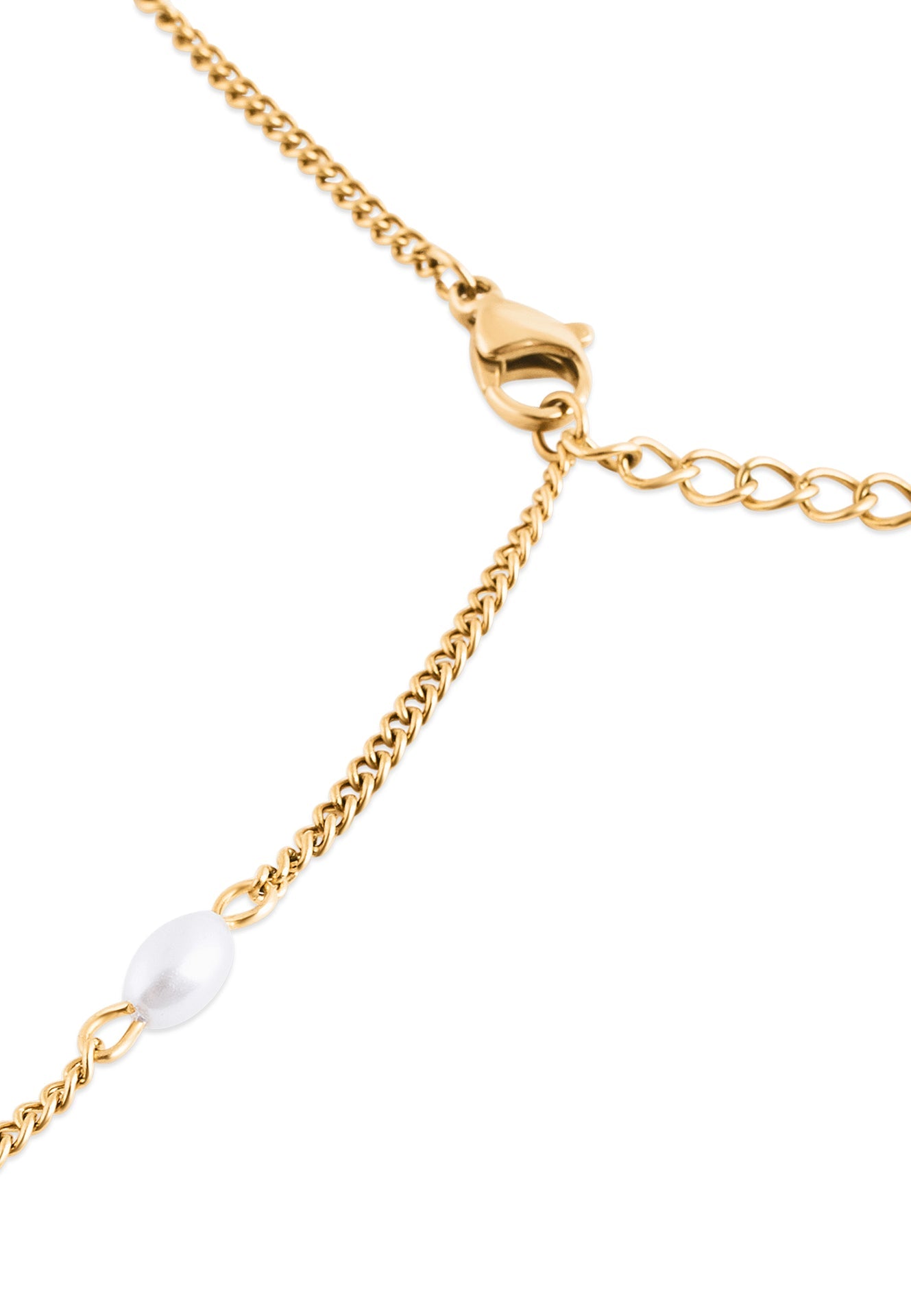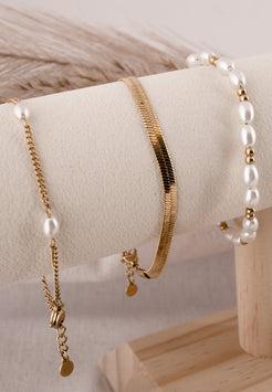 Elegancia sutil, detalle refinado. La Pulsera Devoción combina perlas de imitación de alta calidad con cuentas doradas pulidas, espaciadas delicadamente a lo largo de una cadena fina. Ligera y atemporal, es la pieza perfecta para usar a diario, sola o en capas.