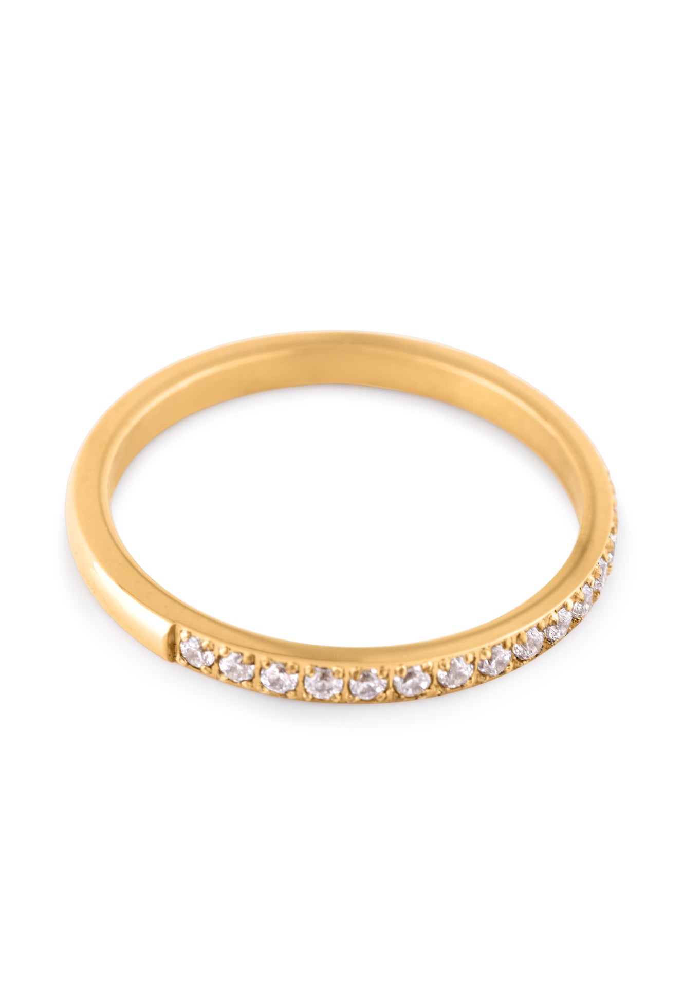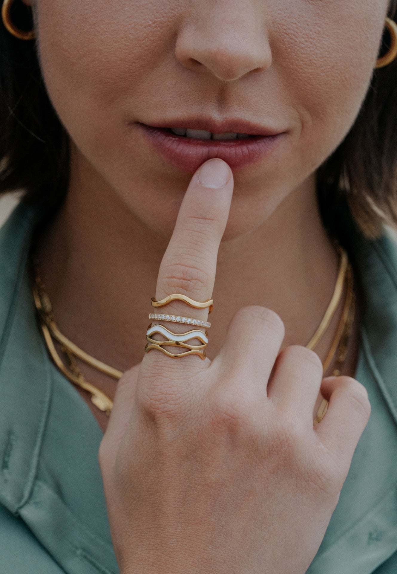 Brillo discreto con encanto refinado. El Anillo Elegancia presenta una banda delgada y pulida de oro adornada con piedras alternadas de corte baguette y redondo. Su delicado resplandor lo convierte en la pieza perfecta para apilar o llevar sola con una sutil sofisticación.