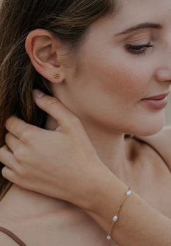 Encanto delicado en plena floración. El Arete Flourish es un pequeño pendiente floral, elaborado en acero inoxidable con acabado dorado pulido. Con su motivo minimalista de margarita, aporta un toque suave y femenino a tu estilo – lo suficientemente sutil para el uso diario, lo bastante encantador para destacar.