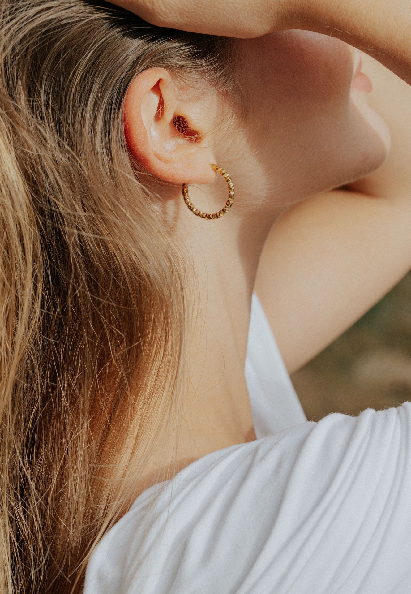 Brillo delicado se encuentra con textura juguetona. El Glow Earring es un diseño ligero de aro elaborado en acero inoxidable con tono dorado, que presenta una secuencia única de discos texturizados y pulidos. Su silueta aireada y su sutil brillo lo convierten en un favorito versátil tanto para el uso diario como para la noche.