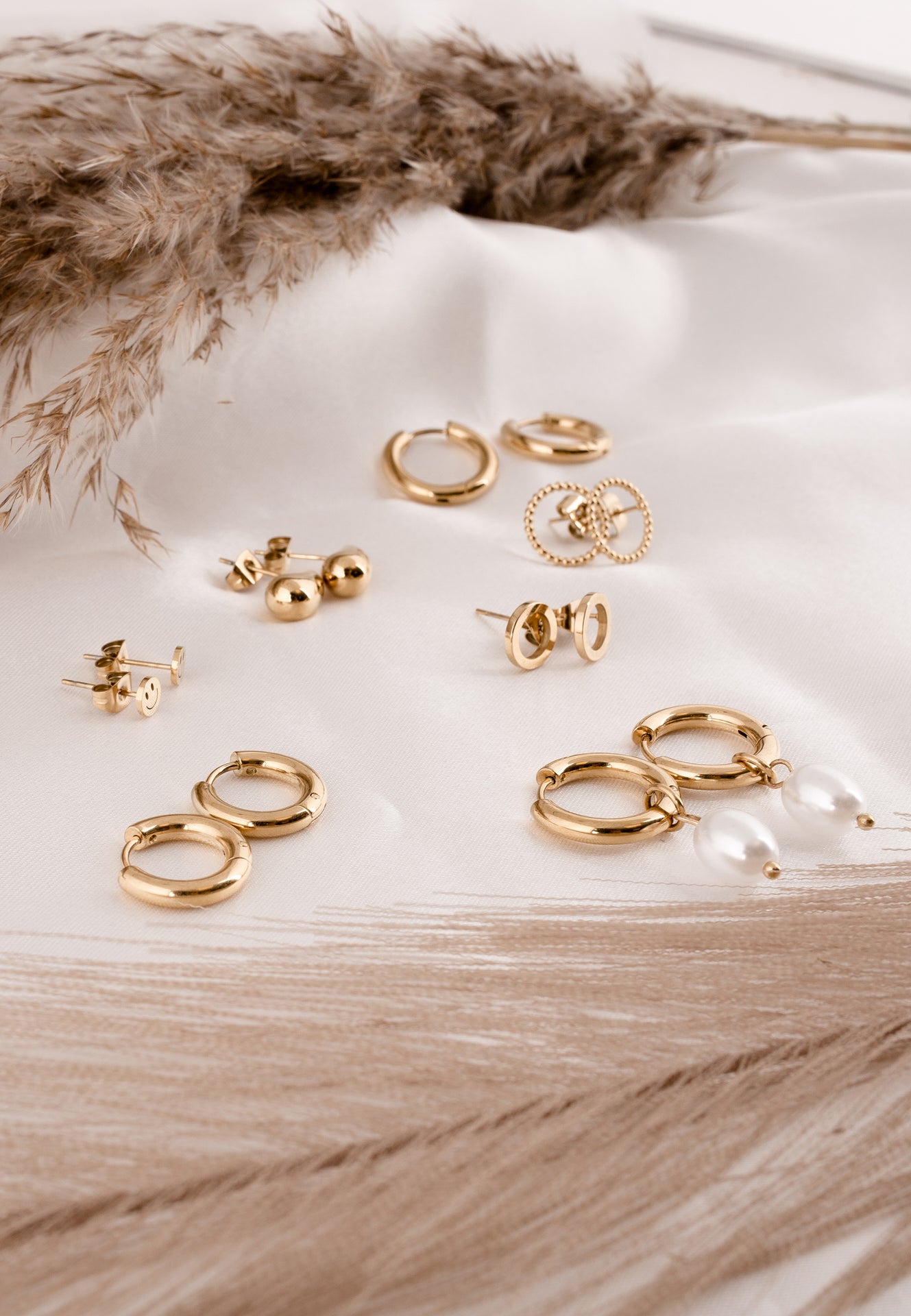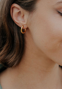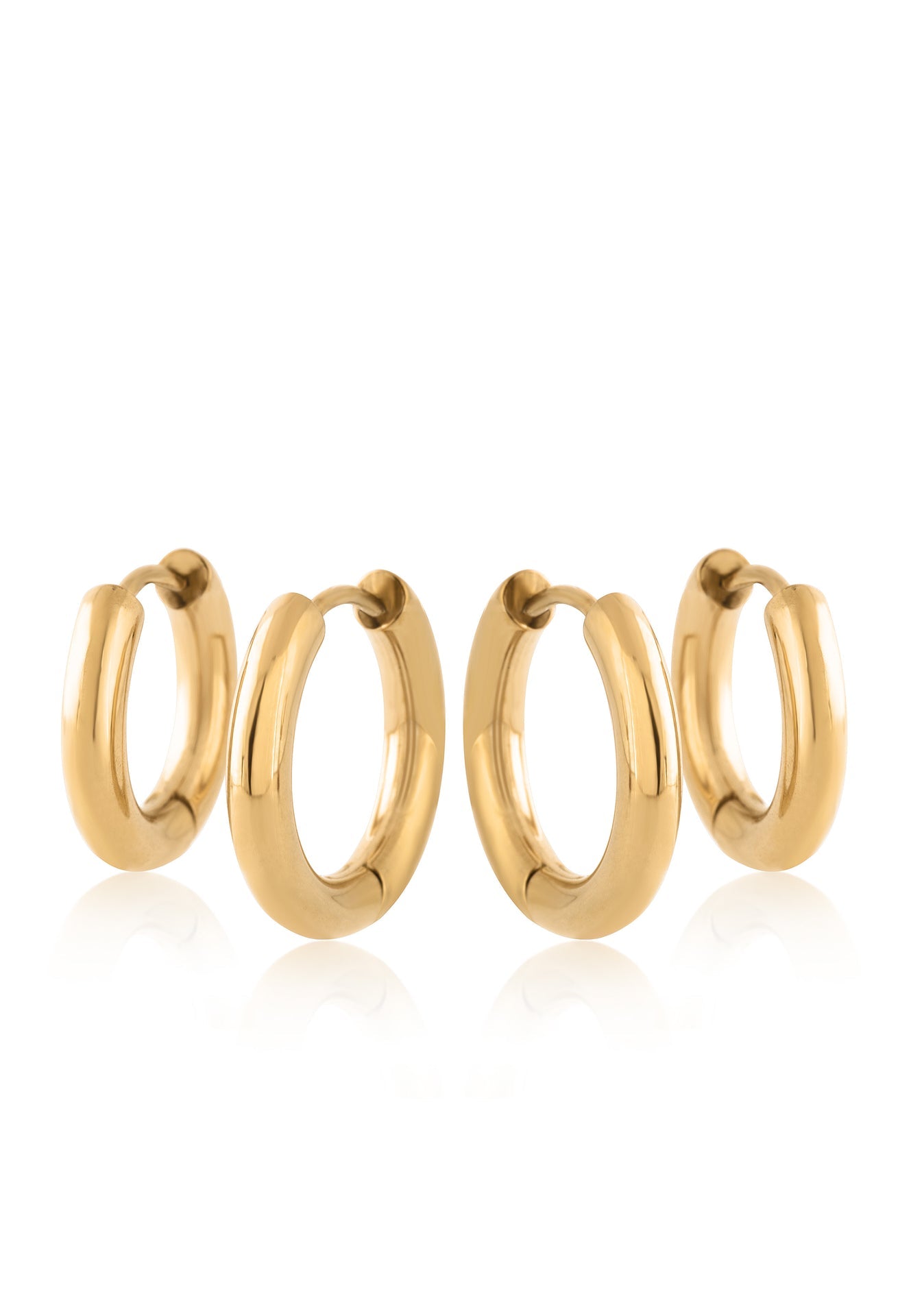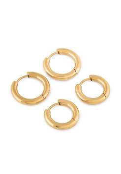Aros más gruesos para una declaración más brillante. El conjunto Lumina Earring ofrece dos pares de aros gruesos en tono dorado en tamaños más grandes, perfectos para llevar apilados o solos. Elaborados en acero inoxidable pulido, estos esenciales versátiles realzan tu estilo con volumen y brillo.